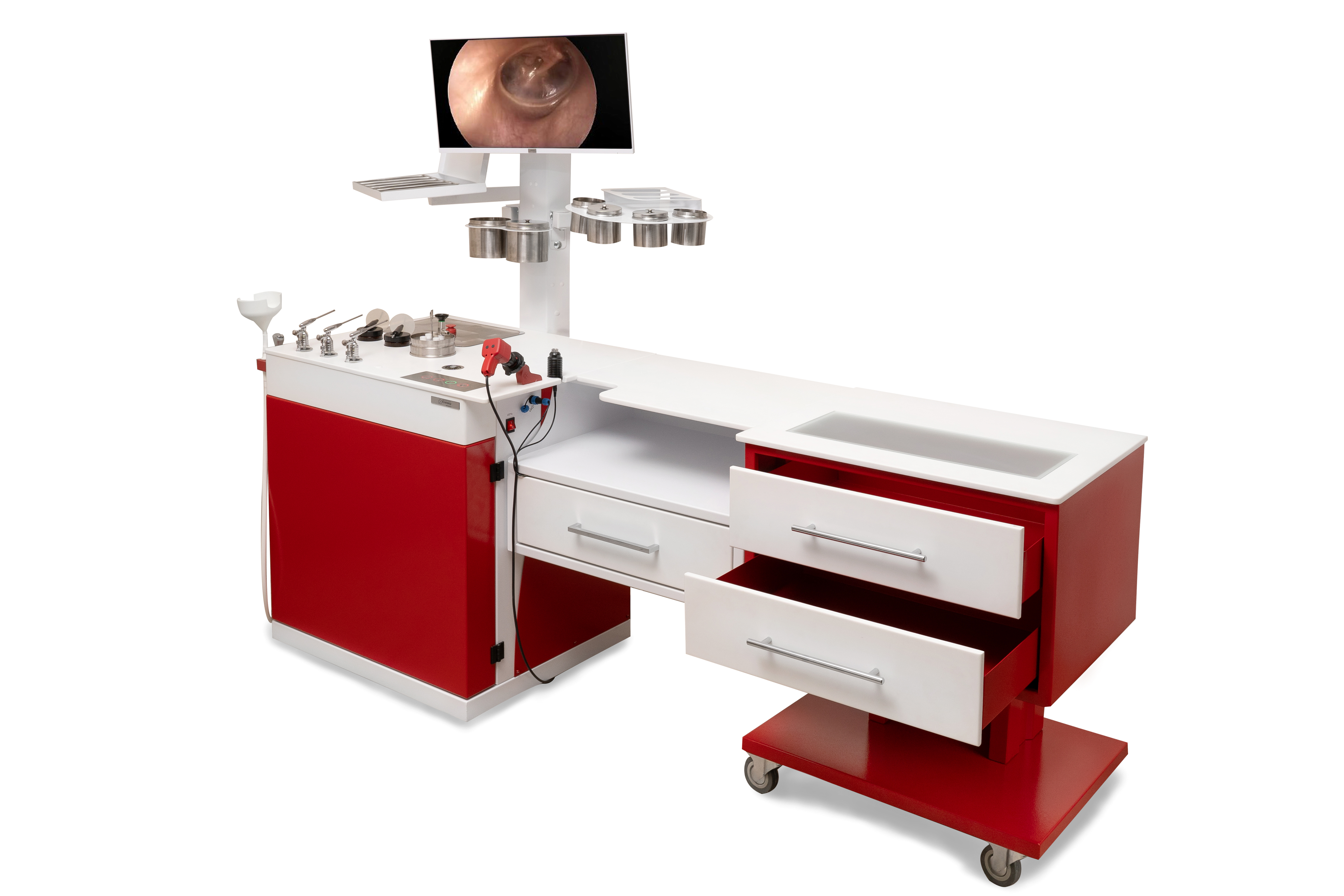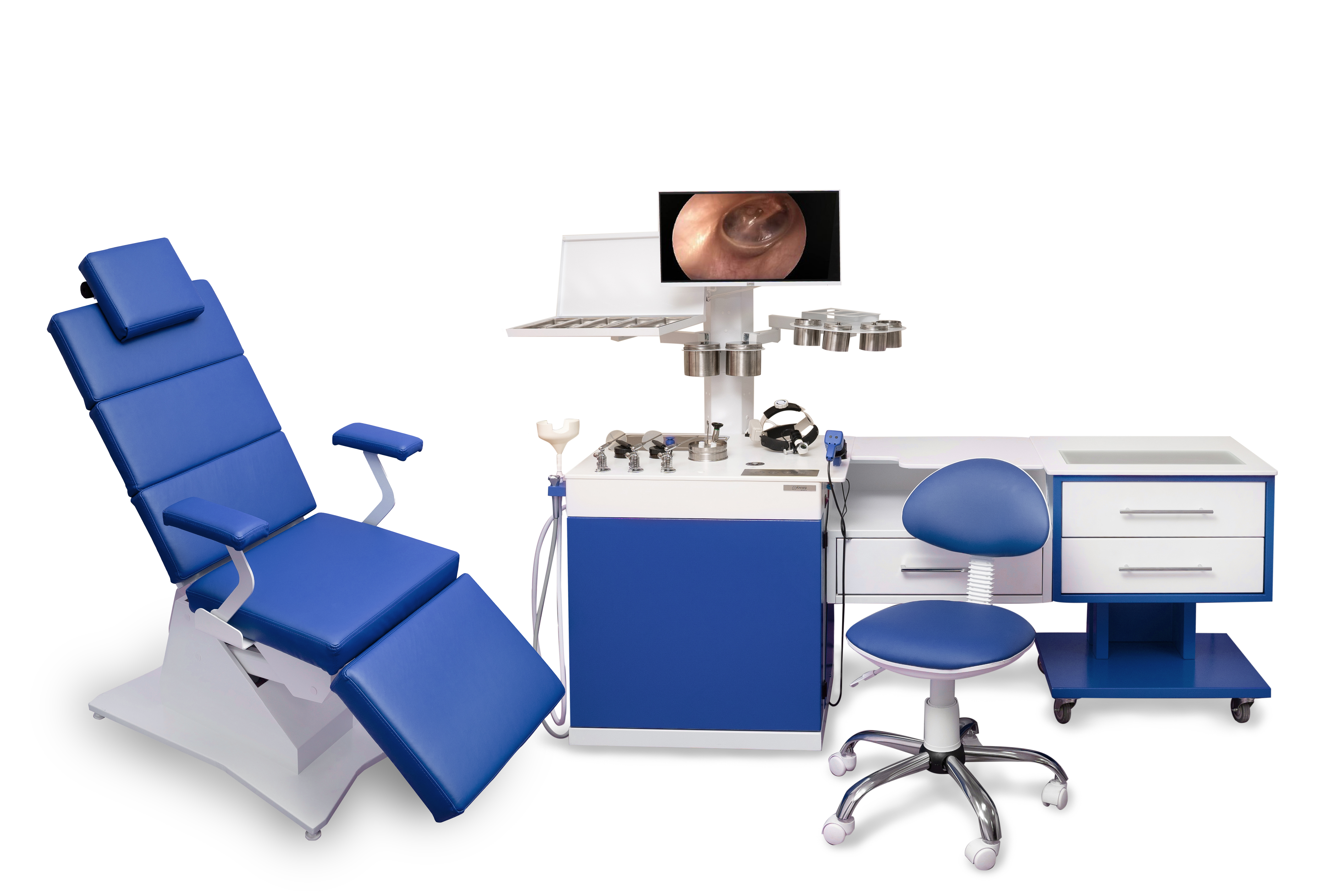 Установка включает в себя эргономичный ЛОР-стол, оснащенный системами аспирации (отсоса) и распыления лекарственных средств, органайзерами для инструментов и стерилизационным подогревателем.