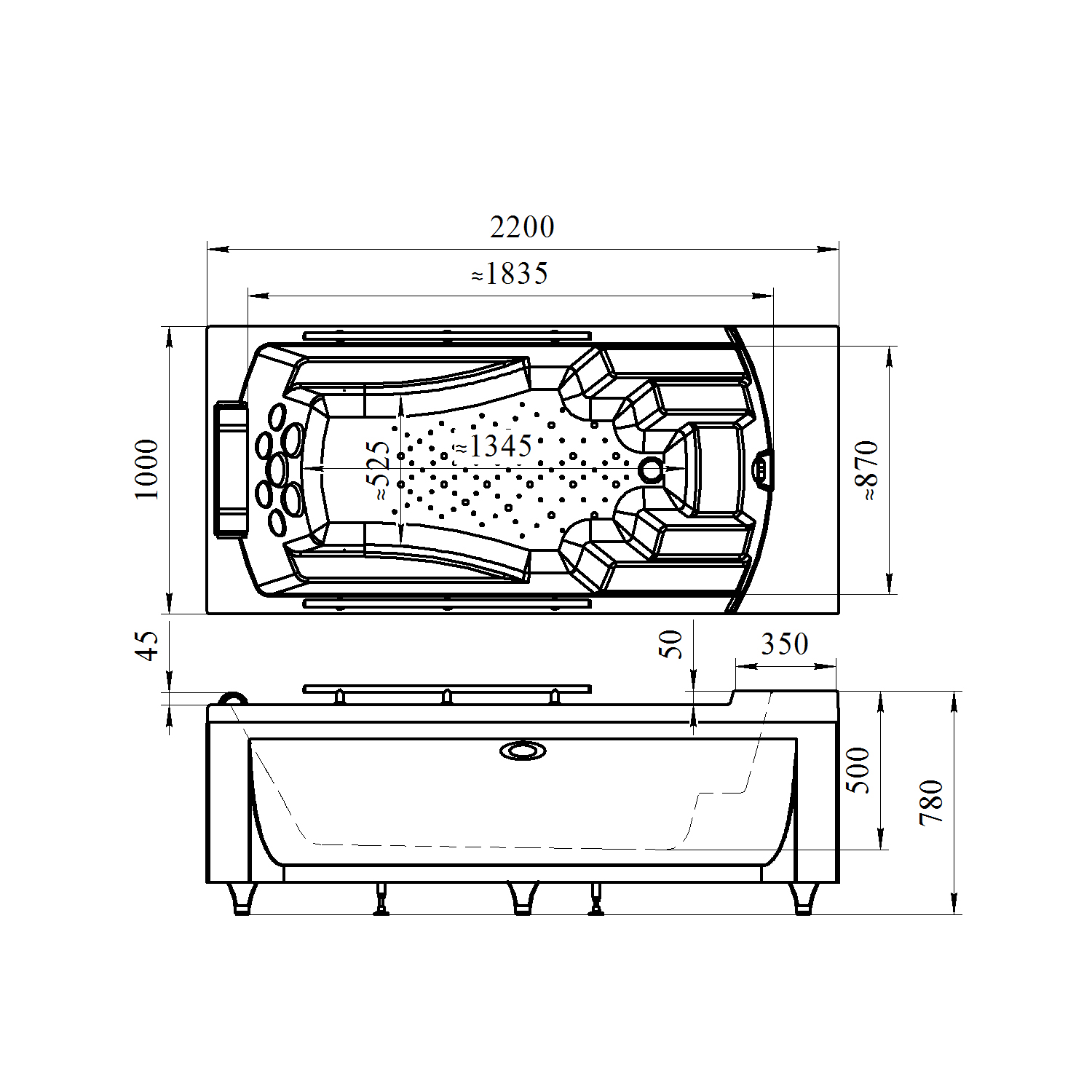 27 гидромассажных и 10 аэромассажных форсунок распределены по внутренней поверхности ванны таким образом, чтобы максимально качественно проработать основные, наиболее проблемные зоны: