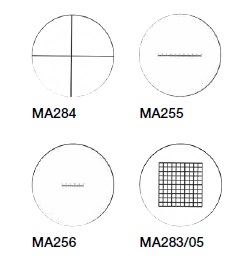Микрометры ∅ 19/21 мм для использования с окулярами МА413/MA407: перекрестие, перекрестие с градуировкой, линейная шкала, решетка. А также микрометры столиков с линейной шкалой 1 мм и 0,4".