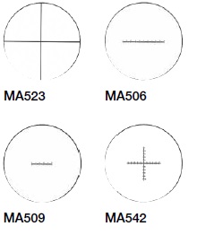 Микрометры ∅ 25 мм для использования с окулярами MA817 и МА859: перекрестие, перекрестие с градуировкой, линейная шкала, решетка. А также микрометры столиков с линейной шкалой 1 мм и 0,4".