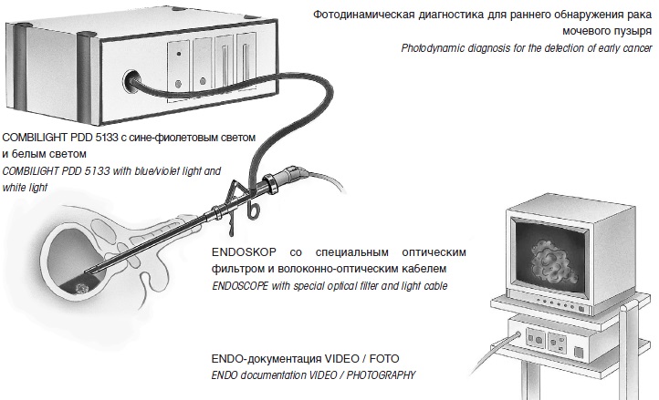Фотодинамическая диагностика (PDD) или флюоресцентная цистоскопия является основным методом диагностики рака мочевого пузыря на ранней стадии. Этот метод основан на избирательном накоплении специальных веществ клетками опухоли. Эти вещества обладают флуоресцентными свойствами, то есть при освещении их светом с одной длиной волны, они возвращают свет с другой длиной волны. Для проведения фотодинамической диагностики используются такие вещества, как “ALA®", "HEXVIX®" и другие. Эти вещества вводятся в мочевой пузырь на время, определенное производителем. В мочевом пузыре краситель меняет химическую структуру и избирательно накапливается опухолевыми клетками, флюоресцируя в красно-розовом спектре при сине-фиолетовом освещении.