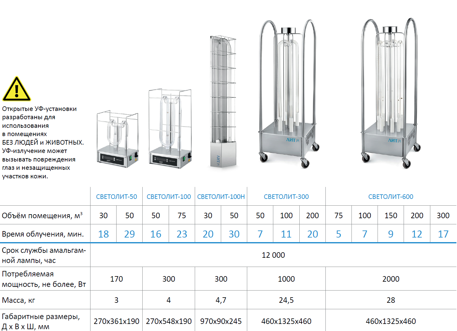 Все облучатели изготавливаются из высококачественной нержавеющей стали и элементов, устойчивых к действию УФ-излучения и химических дезинфектантов. Облучатели могут работать в течение нескольких лет без замены ламп (срок службы ламп – 12 000 часов непрерывной работы).