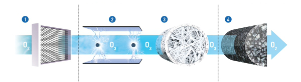 Адсорбционно-каталитический блок (4). Производит глубокую очистку воздуха от газов, вредных веществ и запахов за счет специальной смеси сорбентов и катализаторов. Благодаря большому ресурсу, не требует замены в течение всего срока эксплуатации. Озон полностью разрушается адсорбционно-каталитическим блоком (4) и не попадает в помещение.