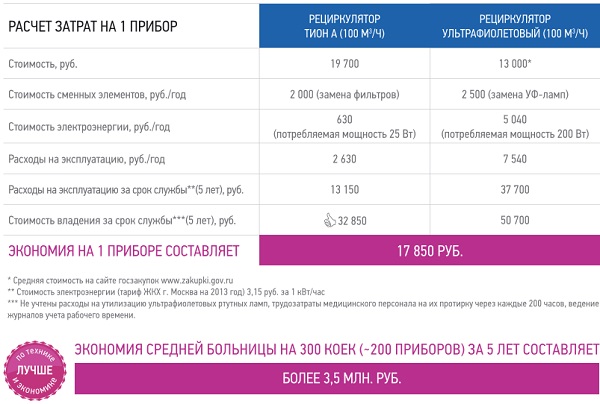 В Тион применены современные энергосберегающие технологии, поэтому энергопотребление Тион А в 10 раз ниже УФ-рециркуляторов, а сменные элементы дешевле УФ-ламп, что делает Тион А более дешевым в эксплуатации. Экономия в масштабах больницы за 5 лет составляет более 3,5 млн. рублей. Расчет экономической выгоды от применения рециркуляторов Тион А.