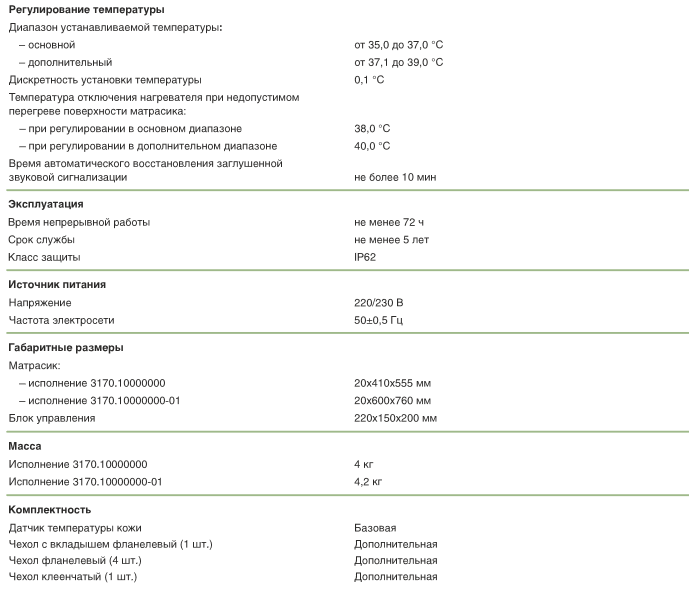 - Автоматическое отключение нагревателя и сигнализация при достижении температуры матрасика 38 °С (при регулировании в основном диапазоне) или 40 °С (при регулировании в дополнительном диапазоне)