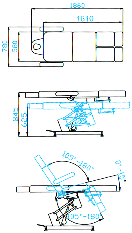 Профессиональное педикюрное кресло с подъёмом при помощи электромотора. Регулировка наклона спинки и общего наклона кресла — пневматические. Углы наклона выставляются при помощи педалей, расположенных на станине кресла (за спинкой). Ножные части регулируются независимо друг от друга, при помощи рычагов. Размер (ДхШхВ): Размер (ДхШхВ): 1860х780х625...845 мм |