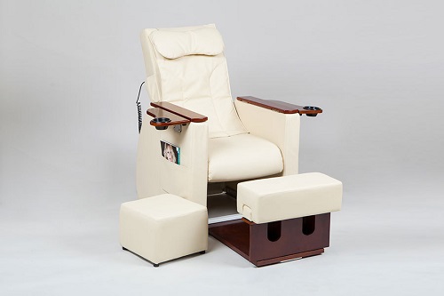 SPA комплекс имеет много опций, которые делают эксплуатацию кресла особенно удобной: откидывающиеся секции подлокотников, подстаканники, скрытые в подлокотниках ниши, выдвижная деревянная подставка для педикюрной ванны с подушкой, регулируемой по высоте, дополнительно - съемная подушка и пуфик для мастера.