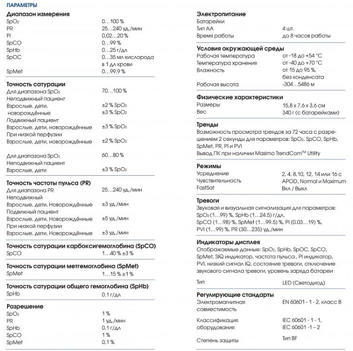 - Технология Masimo rainbow® анализирует несколько длин волн света для измерения общего гемоглобина (SpHb ®), карбоксигемоглобина (SpCO®), метгемоглобина (SpMet ®) и содержание кислорода (SpOC™).