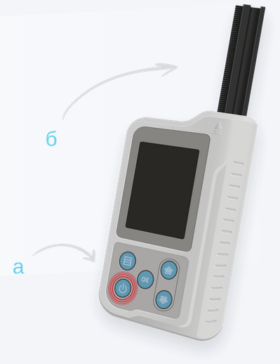 Для начала работы необходимо нажать кнопку (а) для включения, и после самотестирования системы откроется лоток для тест-полоски (б)