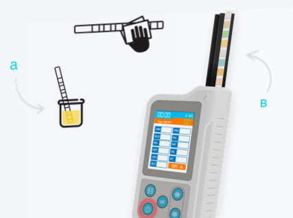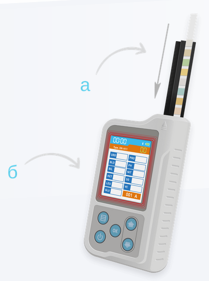 Для проведения анализа необходим образец мочи, хранившейся не более 4 часов. Нужно погрузить тест-полоску в образец мочи (а), затем удалить лишнюю жидкость с помощью салфетки (б) и поместить в выдвижной лоток (в)