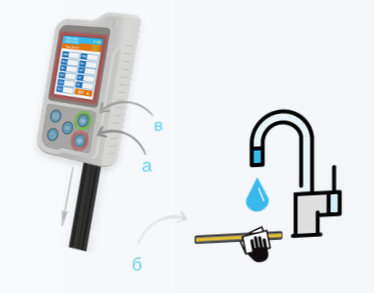 Выдвинуть лоток для промывки - нажать и держать 3 сек. стрелочку "Вниз" (а). После промывки под струей чистой воды протереть и вставить обратно в анализатор (б). Нажать стрелочку "Вверх", что вернет лоток в рабочее положение (в)