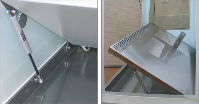 Для удобства уборки поддона цельная столешница поднимается на газ-лифтах (для рабочих станций II Класса)
