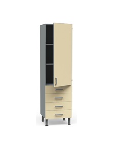 Шкаф медицинский, комбинированный (верх - дверки, низ - четыре выдвижных ящика типа "метабокс"), фасады - ДСП с пластиковым покрытием, корпус - ЛДСП, опоры металлические Ø 51 мм с регулировкой по высоте.