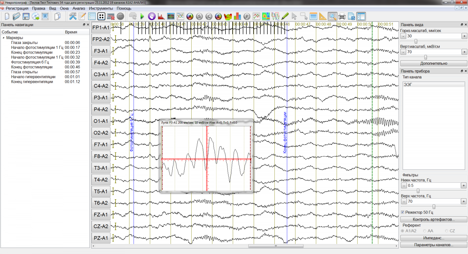 лупа для просмотра выделенного участка ЭЭГ в увеличенном масштабе;