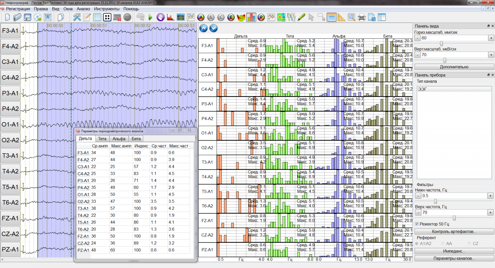 Программный комплекс "Неврополиграф" позволяет рассчитывать тренды амплитуды, мощности спектра или когерентности в заданном частотном диапазоне для выбранных отведений, амплитудно-интегрированной ЭЭГ, средней и максимальной частоты, амплитуды и индексов ритмов, амплитудных и временных параметров полиграфических каналов, количества острых волн.
