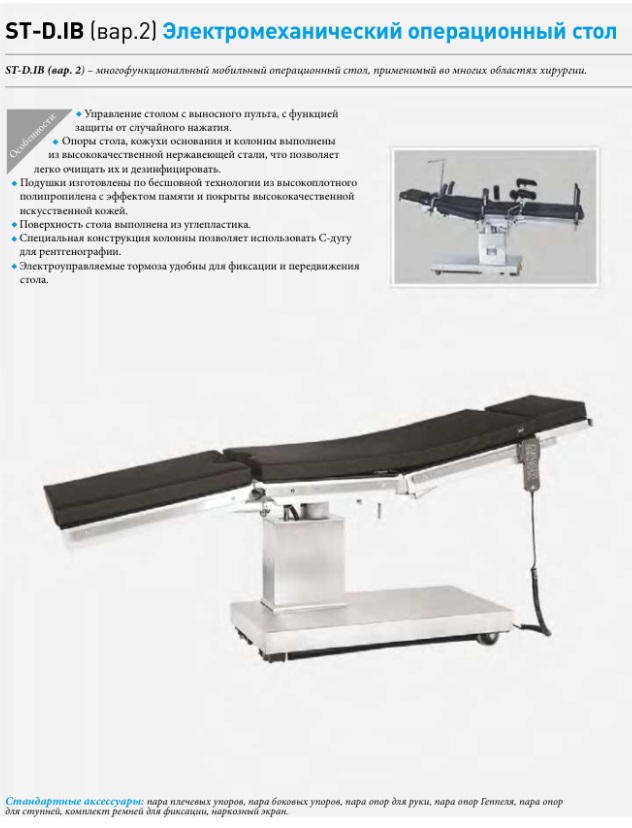 Многофункциональный стол операционный ST-D.IВ (вар.2), предназначен для проведения общехирургических операций. Конструкция стола позволяет использовать аппарат С-дуга по всей длине панели стола.