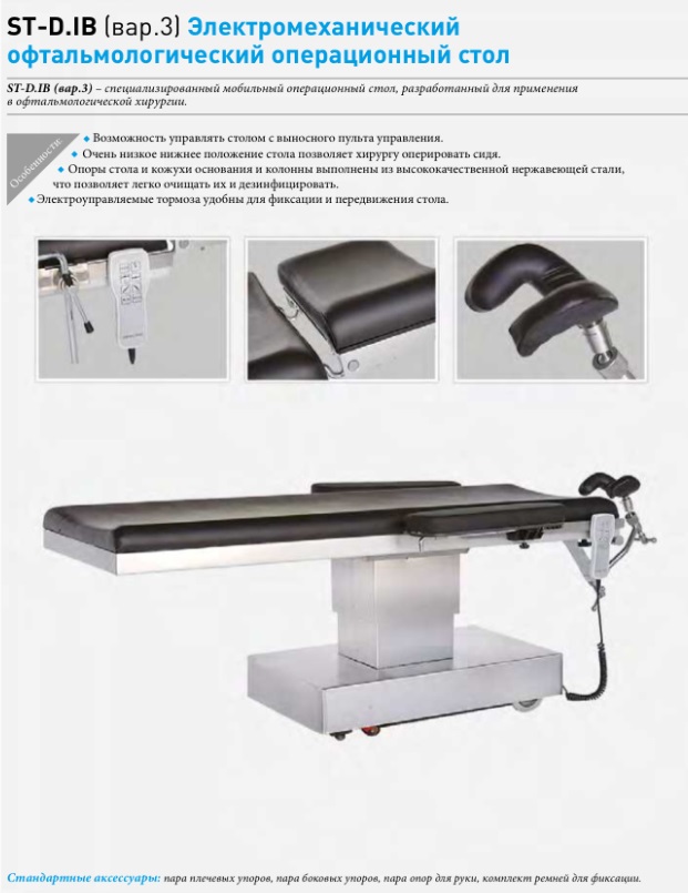 Стол операционный ST-D.IВ (вар.3), предназначен для проведения офтальмологических операций. Управление электромеханическим приводом осуществляется со встроенного пульта управления.