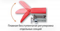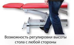 Конструкция, которая предусматривает удобную регулировку высоты стола ногой с любой стороны посредством специального рамного переключателя, позволяет применять его с максимальным комфортом в самых различных областях медицины (ЛФК, кинезотерапия, мануальная терапия, массаж).