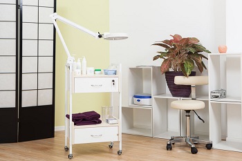 Изделие имеет прочный каркас из стали, покрытой порошковой краской, которая устойчива к механическим и химическим воздействиям. Два выдвижных ящика с ручками и 2 открытых полки предназначены для удобного и рационального хранения и размещения косметических средств, оборудования и инструментов. Дополнительно имеется крепление для лампы-лупы и ручки по бокам для легкого передвижения.