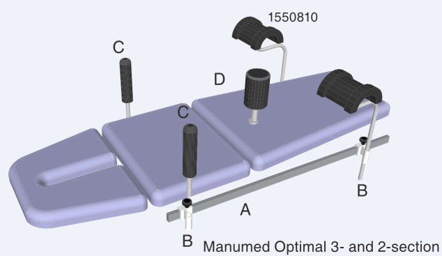 | Для кушеток Manumed Optimal 2 и 3 секционных: A - 3450.134 - набор рельс для крепления упоров и фиксаторов B - 3450.113 - фиксатор на рельсы C - 1550.815 - Упор, черный. Устанавливается в фиксатор 3450.113 D - 3xxx.031 - Тазовый упор. Необходимо заказывать вместе с кушеткой 1550.810 - Гинекологический комплект. Устанавливается в фиксатор 3450.113 |