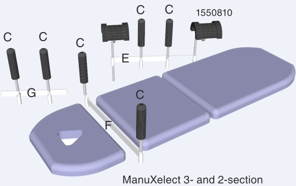 |  | Для кушеток Manuxelect: A - 3450.134 - набор рельс для крепления упоров и фиксаторов B - 3450.113 - фиксатор на рельсы C - 1550.815 - Упор, черный. Устанавливается в фиксатор 3450.113 E - 1550.806 - Планка для фиксации плечевого упора, подмышечного упора и гинекологического набора 1550.810 F - 1550.806 - Планка для фиксации подмышечного упора и гинекологического набора 1550.810 G - 1550.806 - Планка для фиксации плечевого упора
