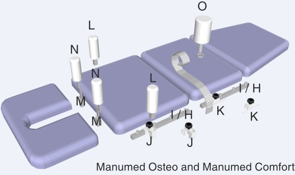|  | Для кушеток Manumed Osteo и Comfort: H - 3450.055 - Набор рельс для крепления принадлежностей (для кушетко типа 312 и 322) I - 3450.056 - Набор рельс для крепления принадлежностей (для кушеток типа 400 или 600) J - 3445.007 - Зажим для упоров K - 3445.006 - Зажим для фиксирующих лент L - 3xxx.007 - Плечевой и подмышечный упор M - 3450.068 - Зажим для плечевого упора N - 3xxx.030 - Плечевой упор для кушеток Manumed Osteo, Traction O - 3xxx.019 - Тазовый упор для кушеток Manumed Osteo, Traction