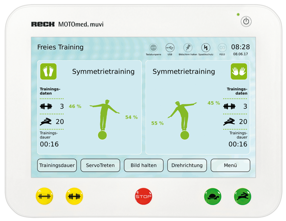 Функция "Симметричная тренировка" на дисплее МОТОмед муви отображается в виде анимированной фигурки, наклоняющейся влево или вправо в зависимости от симметричности движений. Таким образом, при односторонних неврологических заболеваниях, можно «подтянуть» ослабленную часть тела. Пациент в режиме БОС (биологической обратной связи) видит и корректирует эффективность своих движений. "Симметричная тренировка" также предотвращает перегрузку здоровых конечностей тела.