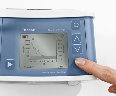 С системой Thopaz установлен новый стандарт в терапии при торакальном дренировании. На основе утечки воздуха у пациента, вблизи грудной клетки пациента подается регулируемое отрицательное давление. Цифровой дисплей показывает текущие данные, а также данные за длительный период времени, позволяющие врачам принимать своевременные и объективные решения по управлению плевральной дренажной трубкой.