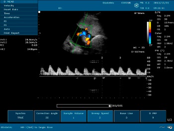 - • Pulse Wave Doppler (Импульсно-волновой допплер) - применяется для количественной оценки кровотока в сосудах. На временной разверке по вертикали отображается скорость потока в исследуемой точке. Потоки, которые двигаются к датчику отображаются выше базовой линии, обратный кровоток (от датчика) - ниже. Максимальная скорость потока зависит от глубины сканирования, частоты импульсов и имеет ограничение (около 2,5 м/с при диагностике сердца). Высокочастотный импульсный допплер (HFPW - high frequency pulsed wave) позволяет регистрировать скорости потока большей скорости, однако тоже имеет ограничение, связанное с искажением допплеровского спектра.