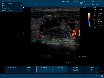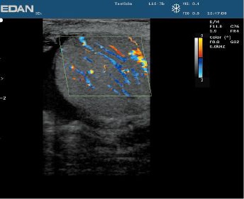 Чувствительность цветного допплера для отображения медленного потока с датчиком L15-7b в работе в здоровом тестикулярном потоке. -
