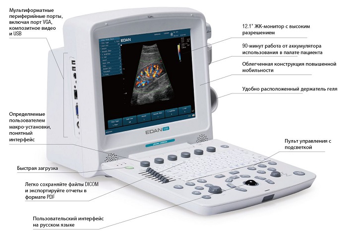 - • Портативный аппарат с цветным допплером.
