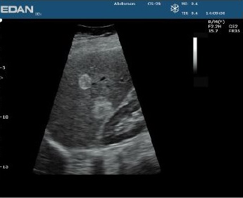 Гармоническое изображение, полученное с использованием датчика C5-2b, увеличивает контрастность при исследовании изменений ткани в печени. -