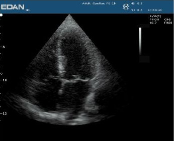 Изображение участка хорды при пролапсе митрального клапана в апикальной четырехкамерной позиции сердца, полученнное с использованием фазированного датчика P5-1b. -