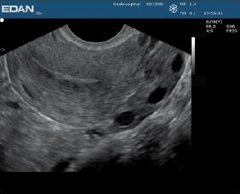 Эндовагинальный датчик E612UB показывает однородность ткани по всему полю зрения, и кристальную ясность изображения фоликул яичников на заднем плане. -