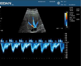 Цветное и спектральное пространственное разрешение с использованием датчика C5-2b при исследовании печеночных вен.
