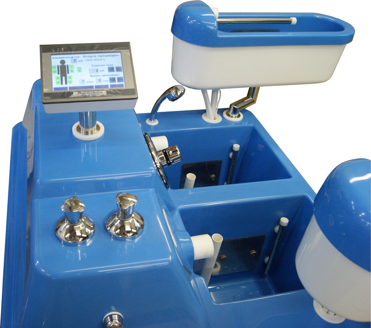 Микропроцессорный блок управления с поворотным цифровым сенсорным дисплеем позволяет создавать и сохранять в памяти до 10 индивидуальных программ в каждом из терапевтических режимов работы ванны (режим струйно-контрастных и электрогальванических процедур).