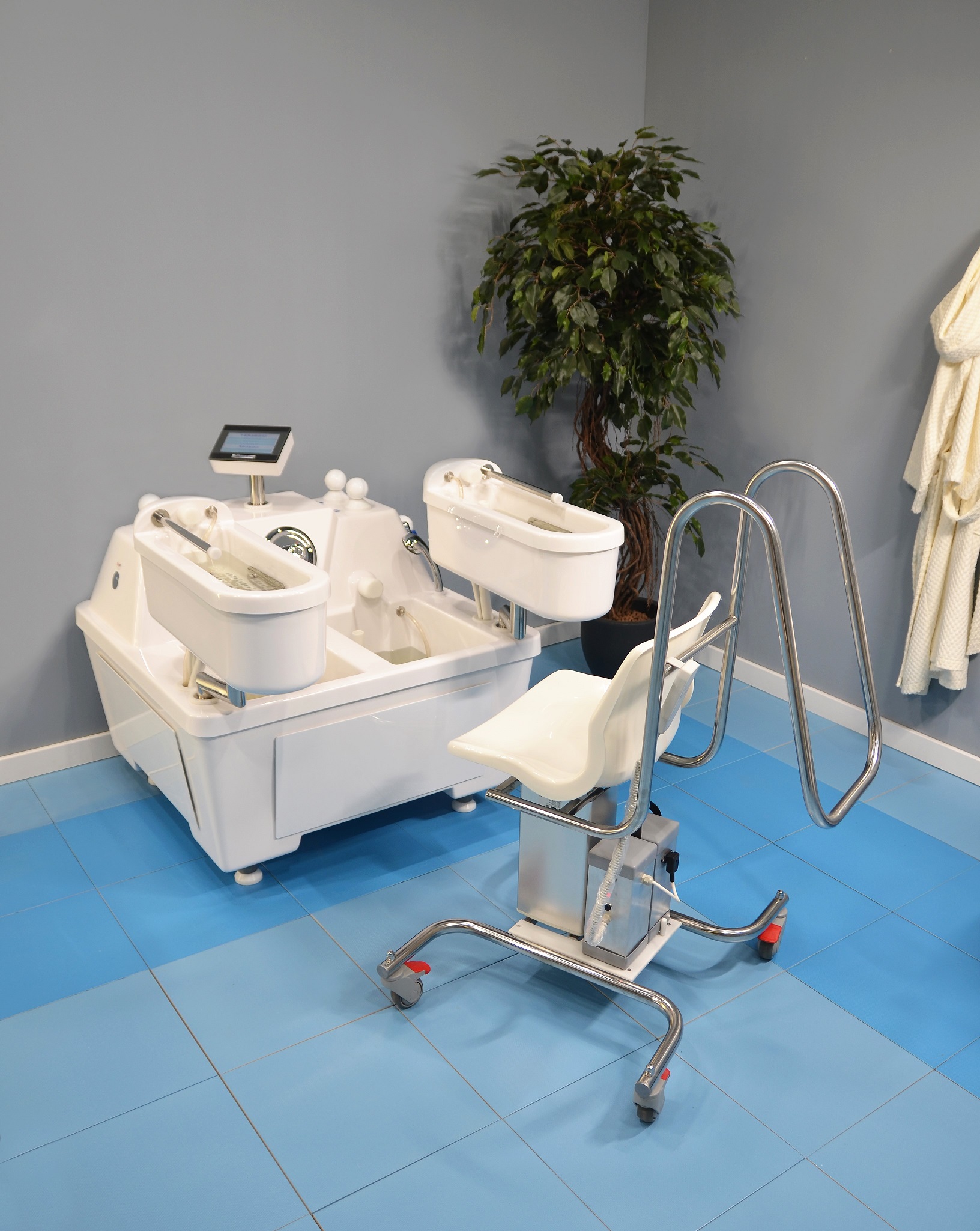 Для комфортного принятия процедур необходим регулируемый по высоте стул с устойчивым к влаге покрытием*, либо специальный автоматический подъемник для камерных ванн*, который также предлагается для пациентов с ограниченными возможностями.