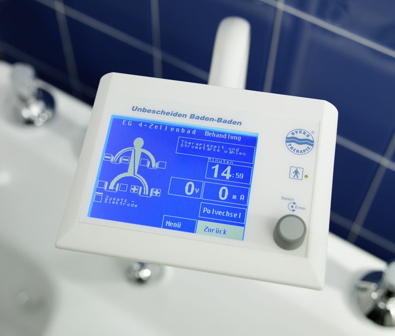 Электрогальваническая ванна оборудована встроенным табло управления с ЖК-дисплеем, на котором отображается время терапии, напряжение, сила тока, ошибки работы и инструкции для пользователя. Для большего удобства во время процедур пульт управления установлен на поворотной консоли на удобной высоте. Помимо уже заданных стандартных программ процедур, возможно также сохранить индивидуальные программы терапии.