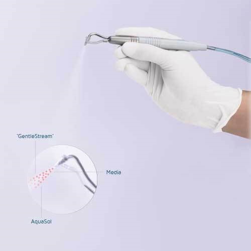 Прибор AQUACARE TWIN многофункционален – две дозаторные камеры позволяют врачу быстро переключаться между двумя порошками (бикарбонатом соды и оксидом алюминия), а значит выполнять такие процедуры как снятие зубного налета и препарирование зубов, не меняя наконечника.