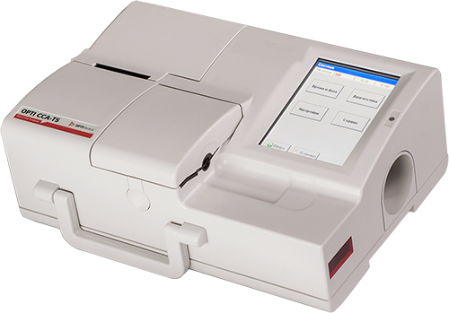 Портативный анализатор газов и электролитов крови OPTI CCA TS – компактный прибор для проведения исследований за пределами медучреждения или в стационаре при тяжёлых состояниях пациентов. В устройстве реализована инновационная технология прямого измерения общего гемоглобина (tHb) и сатурации кислорода (sO2) методом отражательной фотометрии. Также предусмотрена возможность измерения pH, PCO2, PO2, Na+, K+, iCa++, Cl-, глюкозы, лактата, мочевины.