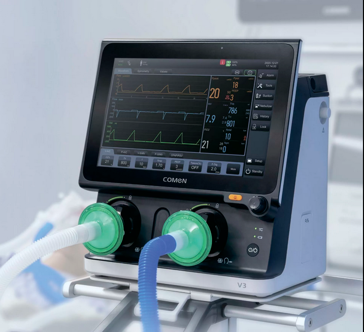 Аппарат ИВЛ турбинного типа COMEN V3 – многофункциональная платформа респираторной поддержки, которая может использоваться как для оснащения реанимационных отделений, так и при экстренной транспортировке пациента. Этот компактный прибор способен подавать газовую смесь со скоростью до 210 л/мин. Интегрированная высокопроизводительная турбина рассчитана на работу без источника сжатого воздуха, а ёмкий аккумулятор обеспечивает 4,5 часа автономного функционирования.