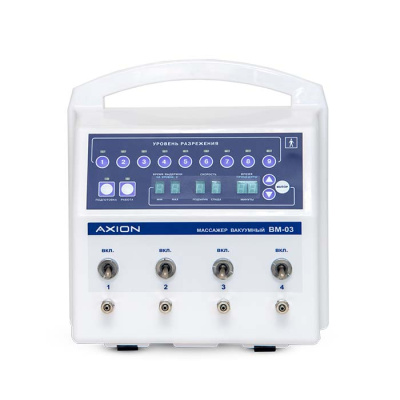 Вакуумный массажёр ВМ-03 выпускается отечественным концерном АКСИОН. Это физиотерапевтическое оборудование, предназначенное для лечения остеохондроза, заболеваний периферической нервной и сосудистой систем, опорно-двигательного аппарата. Терапевтический эффект формируется под воздействием вакуума (разрежения), создаваемого в прозрачных пластиковых насадках, которые накладываются на проблемные зоны, – паравертебральные, на крестцово-ягодичную зону, заднюю поверхность бедра. Аппарат работает в двух режимах: сначала задаются параметры импульсов разрежения, затем выполняется процедура с поддержанием заданного уровня.