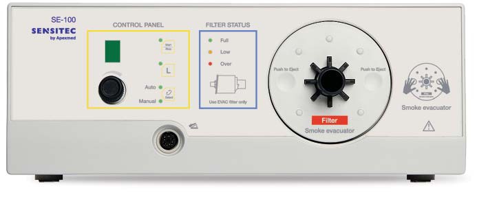 Эвакуатор дыма SE-100 – эффективная и надёжная система отведения и фильтрации испарений от итальянской компании SENSITEC. Аппарат оснащён активными угольными фильтрами для удаления запаха с эффективностью 99,9 %. Активация аспирации, регулировка мощности и выбор рабочего режима осуществляются дистанционно через автоматическую электронную систему или вручную, нажатием кнопки. Параметры аспирации отображаются на панели управления с пленочным символьным дисплеем с влагозащитной клавиатурой и световыми индикаторами.