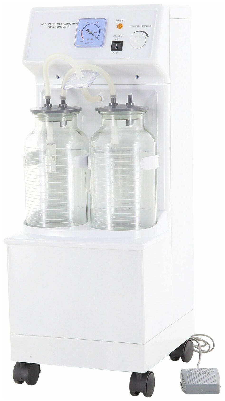 Электрический аспиратор (отсасыватель) Н001 предназначен для отсасывания биологических жидкостей, газов и частей ткани из операционных ран в процессе хирургического вмешательства и в реабилитационный период. Модель оснащена двумя резервуарами для сбора жидкости объёмом 2,5 литров каждый. Для удобства перемещения прибора в нижней части корпуса установлены ролики.