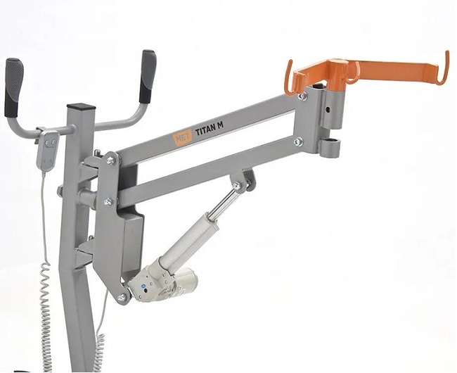 Модульный подъемник MET TITANM – переносная система, предназначенная для перемещения лежачих больных и инвалидов. Подъёмник имеет уникальную конструкцию, что позволяет пересаживать пациента с кровати в коляску, с коляски в ванну или в автомобиль. Оборудование весит всего 16 кг, его можно использовать даже в стеснённых условиях – в ванной комнате, в коридоре, в автомобиле. Данная модель оснащена траверсой, расположенной на уровне груди. Это существенно облегчает процесс посадки. Для устойчивости предусмотрены раздвигающиеся ножные опоры.
