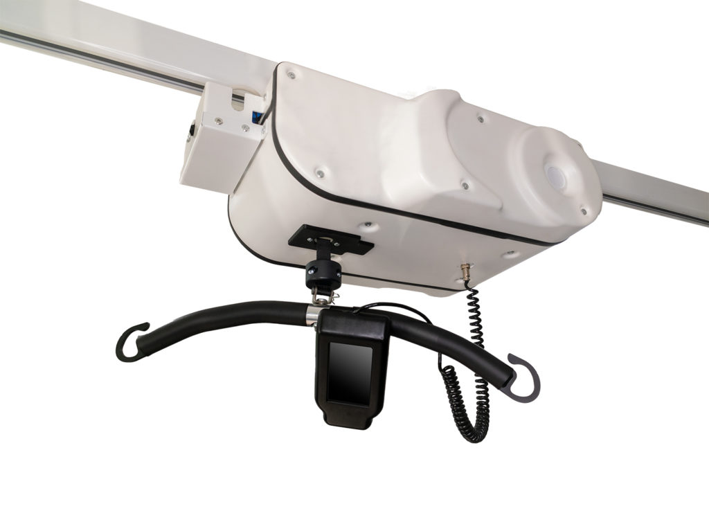 - потолочные подъёмники, в конструкции которых предусмотрены блок с электродвигателем, направляющие и подвес;