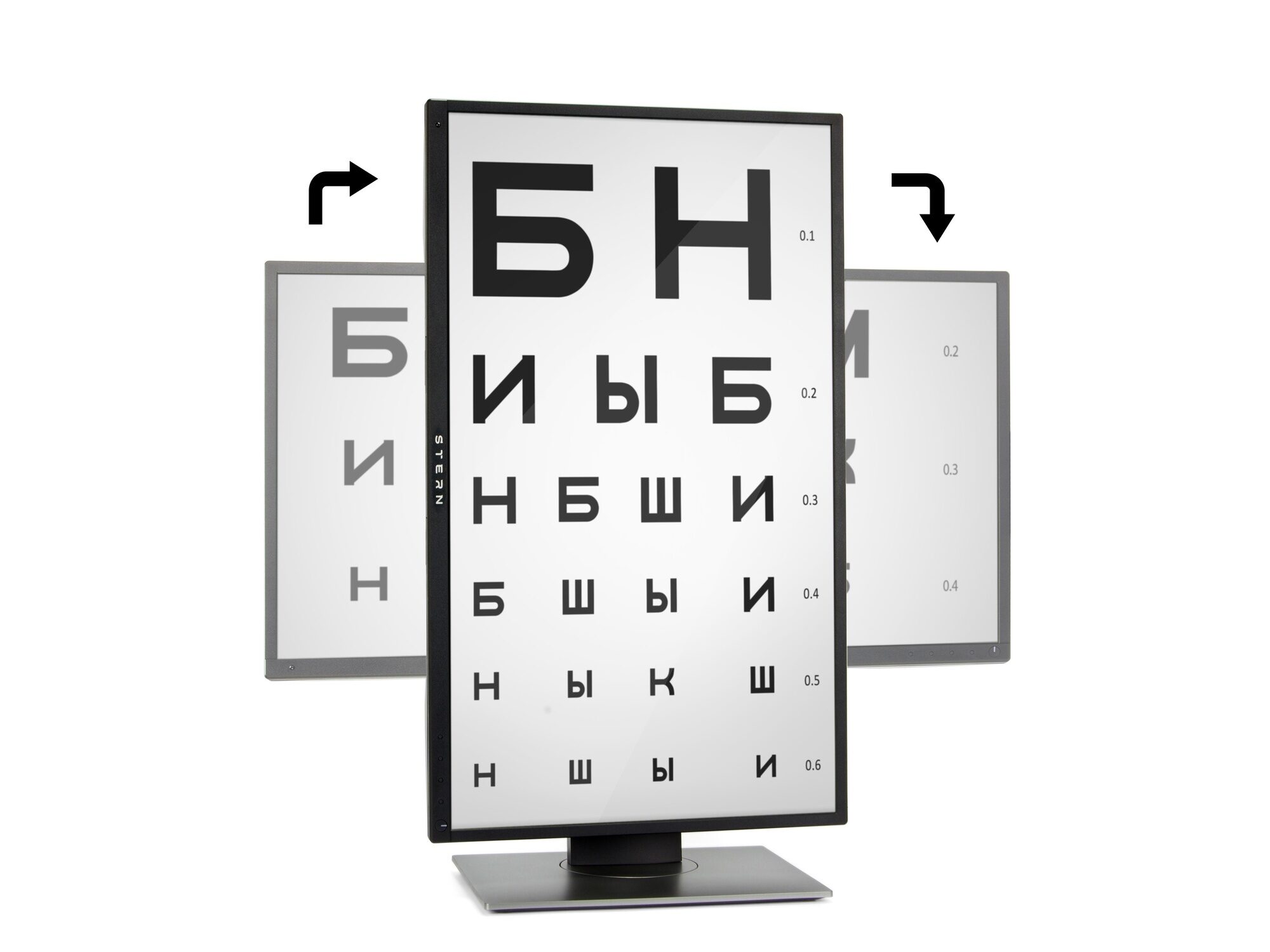 Помимо ручных и автоматических устройств производители предлагают экранные модификации. Это дорогостоящее оборудование, поставляемое в комплекте с экраном с подсветкой и компьютерным блоком управления. Таблицы выводятся на экран по команде программного модуля. В зависимости от варианта тестирования экран можно перемещать ближе к пациенту или дальше от него. Диапазон регулировки рабочего расстояния – от 2,5 м до 8 м. Это приборы высокой точности, предназначенные для оснащения офтальмологических кабинетов в специализированных клиниках.