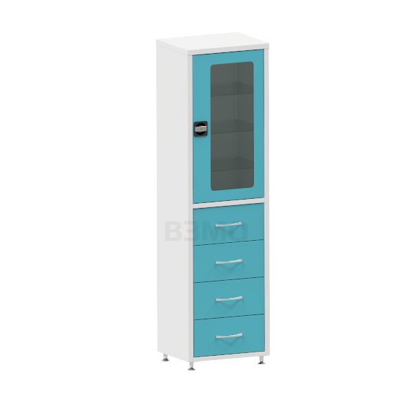 Шкаф ШМЯ СКБ-1С – двухсекционный одностворчатый вариант, изготовленный из металла толщиной 0,8 мм. Верхняя секция оснащена тремя полками из стекла, нижняя – четырьмя металлическими ящиками. Ящики перемещаются по направляющим скрытого монтажа с доводчиками, на верхней дверце установлен ригельный замок.