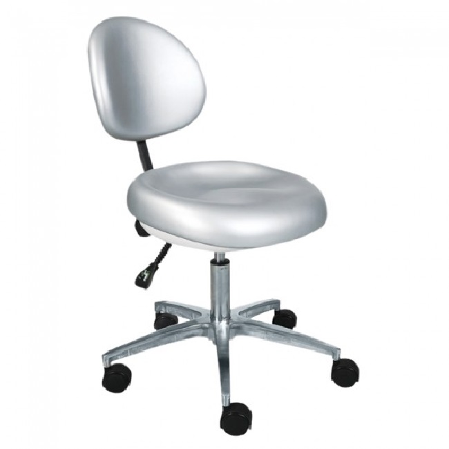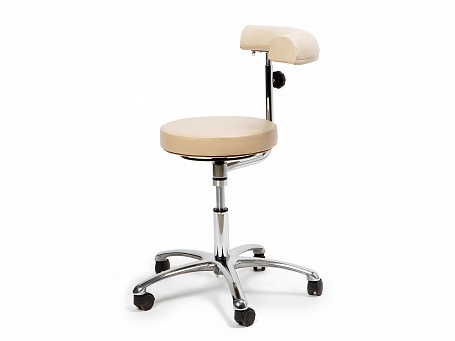 ТБМ-7 – стоматологический мобильный табурет с вращающейся ручкой-спинкой, предназначенный для удобного размещения врача рядом с пациентом при проведении медицинских процедур. Модель оснащена пневматическим механизмом регулировки высоты. Ручка регулировки, выполненная в виде кольца, расположена под сиденьем. Табурет вращается на 360°, поэтому врач может принимать наиболее удобную позу при выполнении манипуляций. Эргономичная конструкция и увеличенный размер ручки-спинки позволяют использовать ее и как надежную спинку, и как опору для руки. Крестовина кресла изготовлена из алюминиевого сплава, кронштейн спинки – из хромированной стали. Для удобства перемещения по кабинету табурет оснащён пятью поворотными пластиковыми колесами.