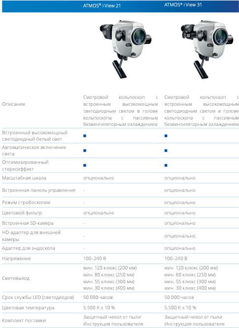 В дополнение к идеально согласованной системе компонентов, кольпоскоп оборудован пятиступенчатым увеличителем, возможностью производить тонкую фокусировку вручную, а также встроенными модулями камеры. Наряду с возможностью интеграции камеры АТМОС, возможно подключение стандартной SD- камеры, дополнительно для получения HD-изображения ATMOS i View располагает возможностью присоединять внешнюю камеру с байонетом типа Sony Е